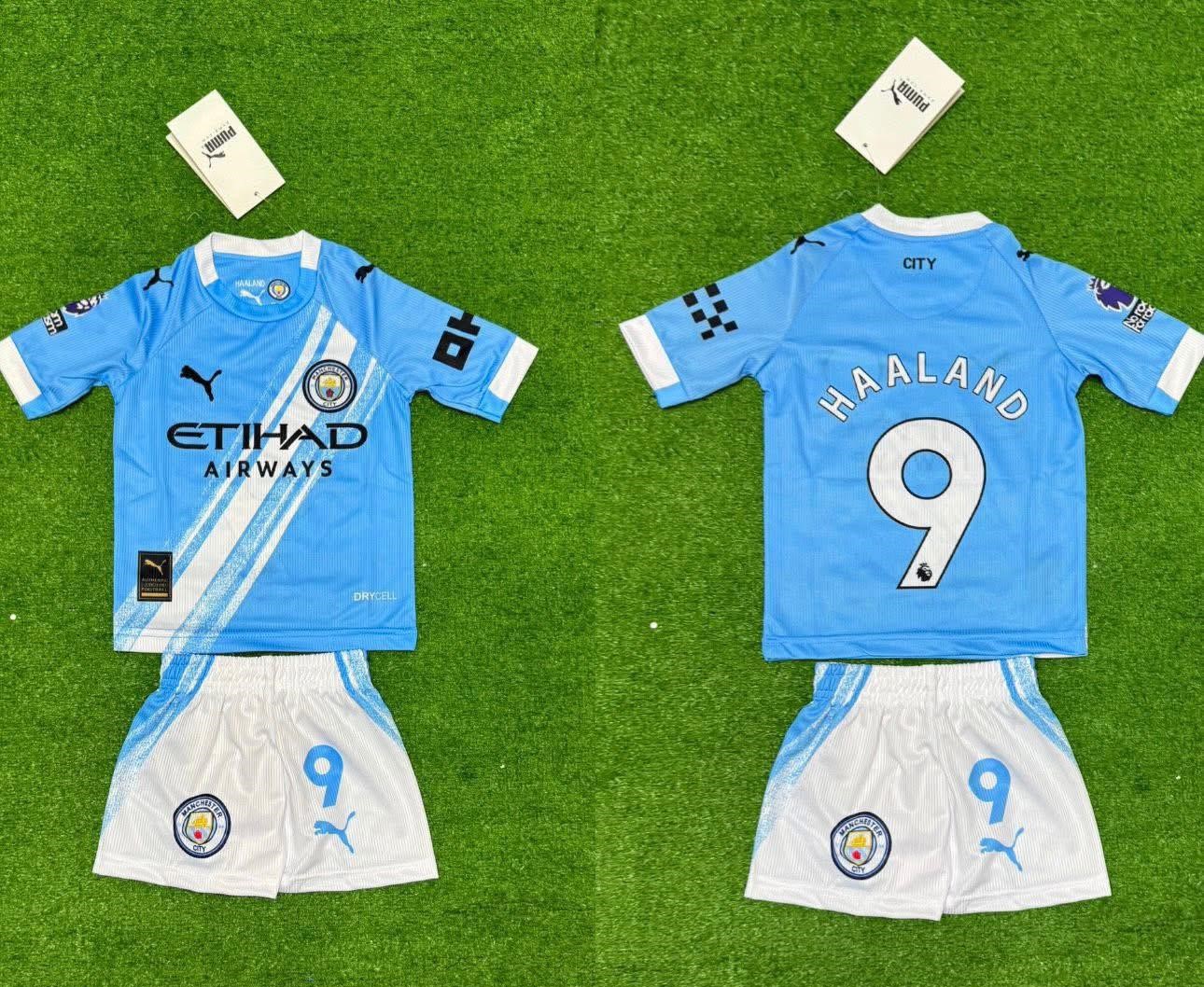 Haaland #9 – Manchester City hemma junior kit 2025/26. Blå Puma-tröja + shorts. DryCELL.